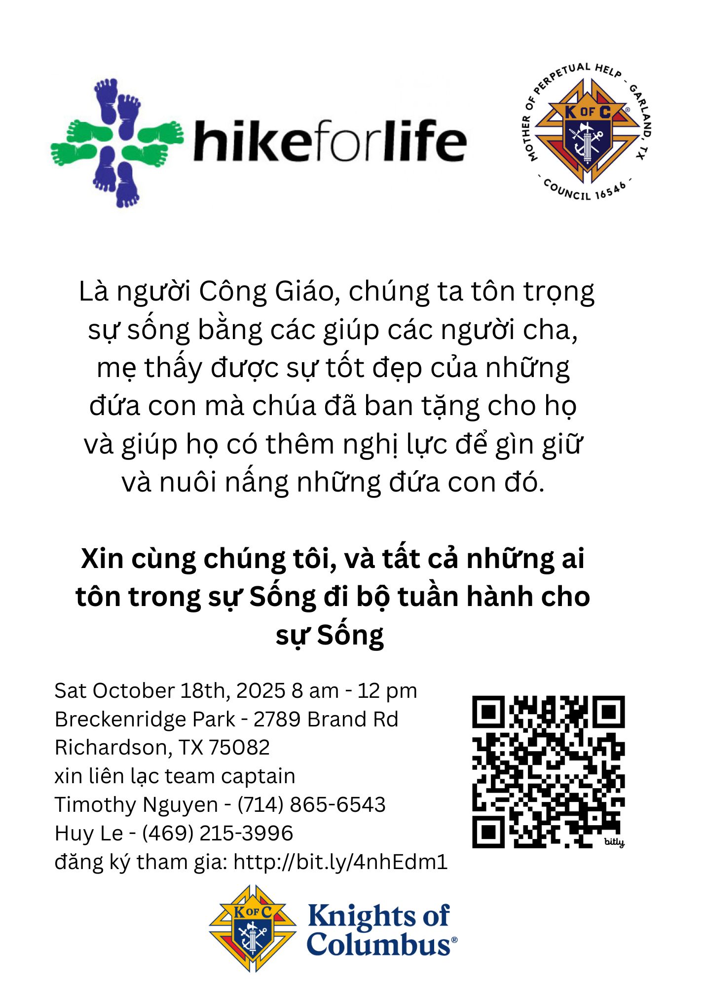 Join the Knights of Council 16546 in Hike for Life - Richardson/Garland Hike Event. This October Pro-Life event is held annually at several locations in and around Dallas. This event has been “Helping Moms and Savings Babies” since 1973.